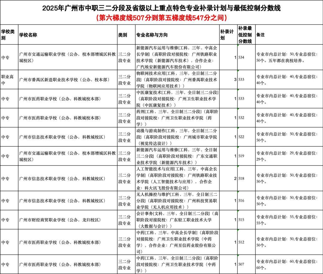 其中,中本贯通补录计划的最低控制线均位于第三梯度线上。广州市轻工职业学校(中本贯通)(机电技术应用)余1个补录计划,补录最低控制分数线为655分。广州市交通运输职业学校(中本贯通)(新能源汽车运用与维修)余1个补录计划,补录最低控制分数线为638分。