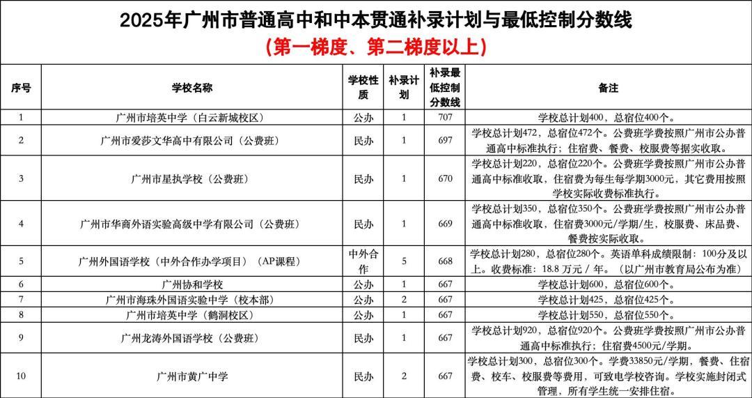 今年,补录最低控制分数线位于第一梯度线(707分)的学校仅1所,即广州市培英中学(白云新城校区),余1个补录计划。