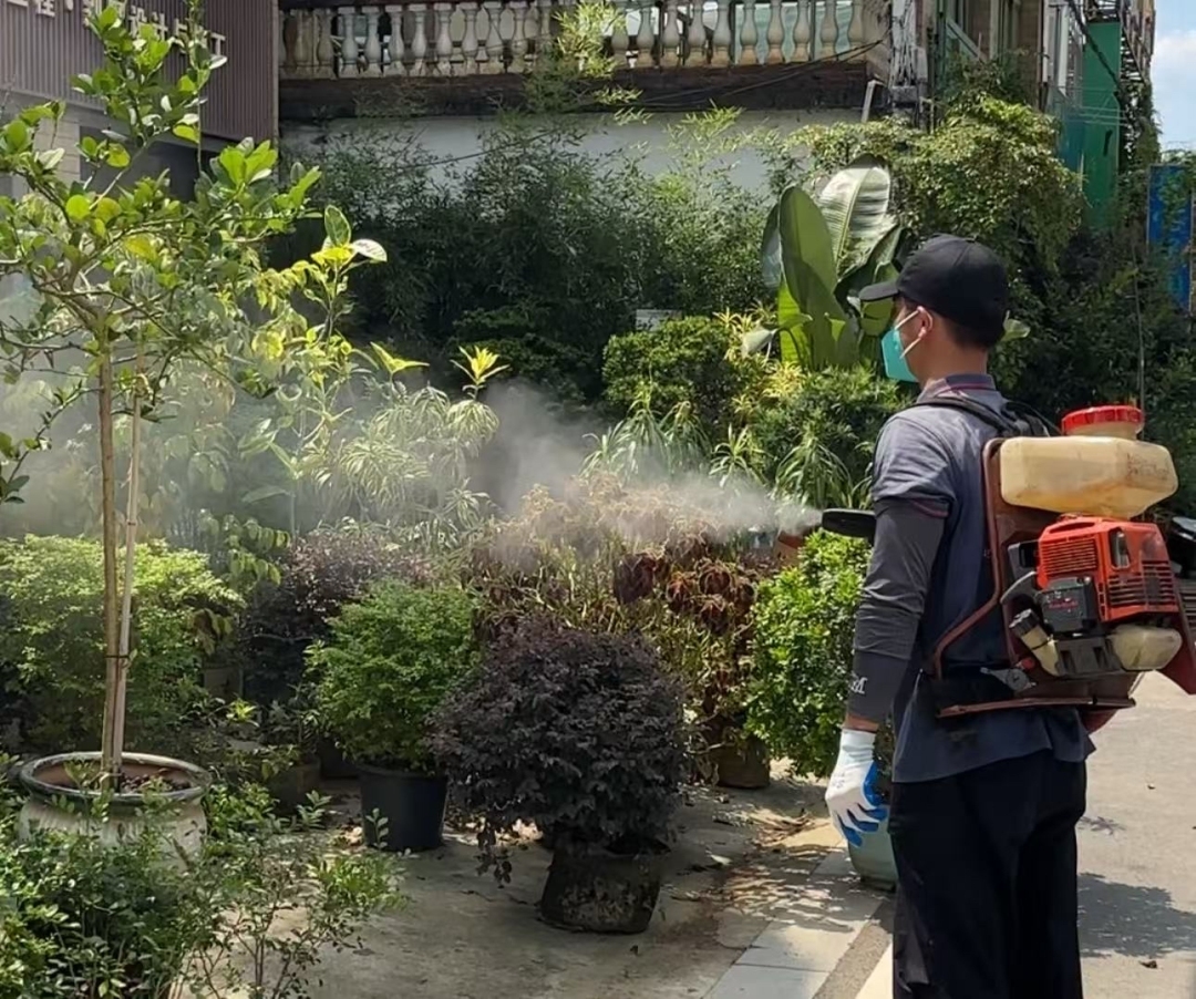 广州花博园位于广佛交界,花草苗木众多、蚊虫孳生风险较大。当天,来自越泰(广东)环境技术有限公司的12名工作人员分成六组,带着6台机器在各个苗木、园艺档口穿梭,每组一人负责喷洒,一人负责清理积水。