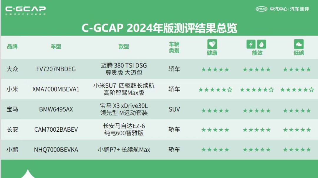 其中,中国绿色汽车评价规程C-GCAP的最新一批车型的测评成绩,共对大众迈腾、小米SU7、宝马X3、马自达EZ-6以及小鹏P7+共5款市场热门车型进行了全面评估,测试严格按照C-GCAP(2024年版)规程执行,围绕车辆健康、能效、低碳等板块展开全面细致测评,旨在为消费者清晰呈现车辆在绿色性能方面的真实表现。