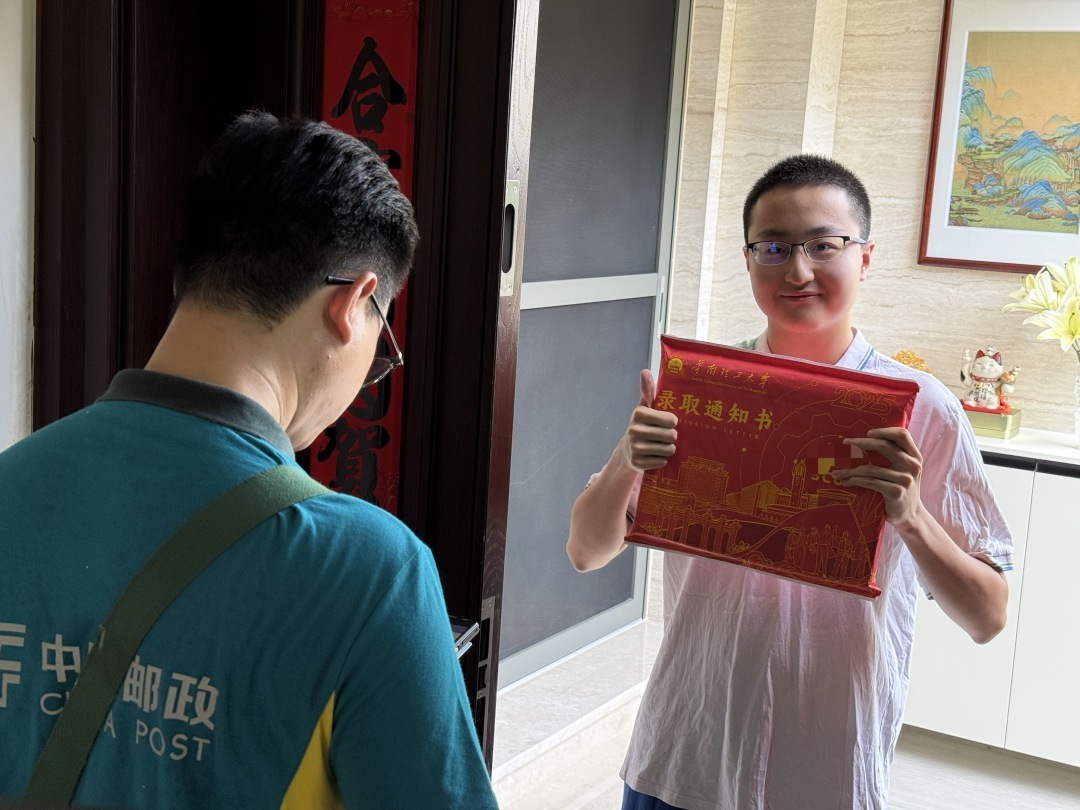 (司浩辰同学开心地从投递员手中接过华南理工大学的录取通知书)