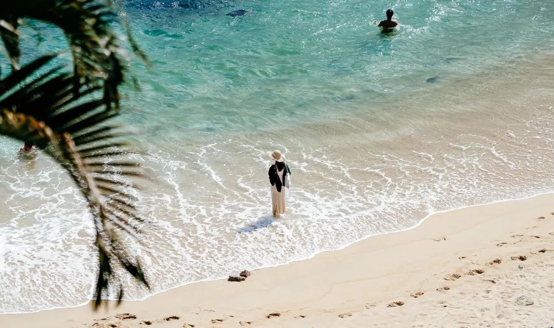 蓝宝石海滩的沙滩虽小但水质清澈透明。这里的海水是蓝至翡翠绿的渐变色调,听风吹浪花拍岸,很是愉快,目之所及都是波光粼粼的一片。