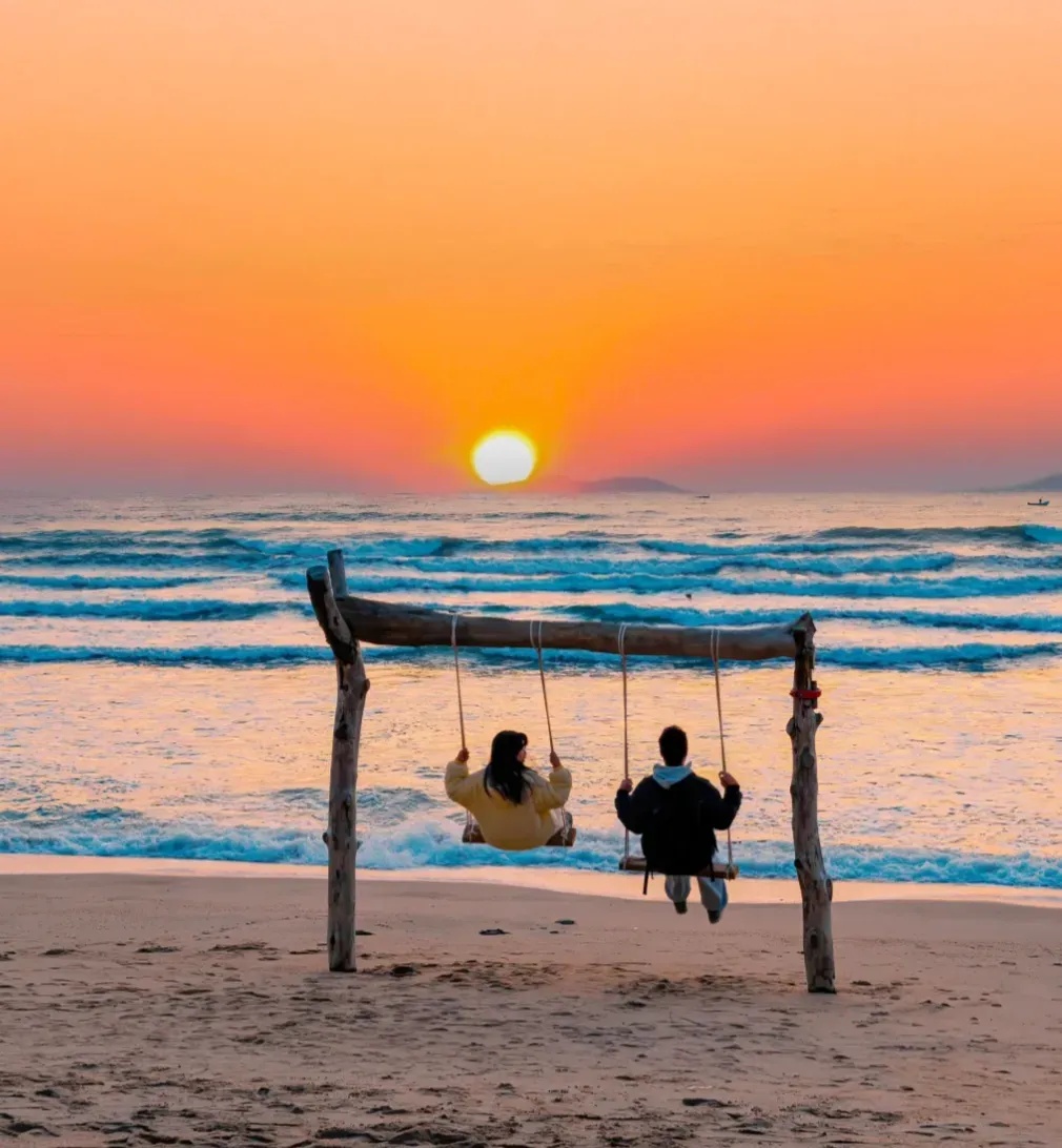 马尾岛海滩海浪平缓,水中安全地带宽阔,容易形成“天空之镜”的景观。日落晚霞漫天时,一组“马尾夕照”让你秒出大片。