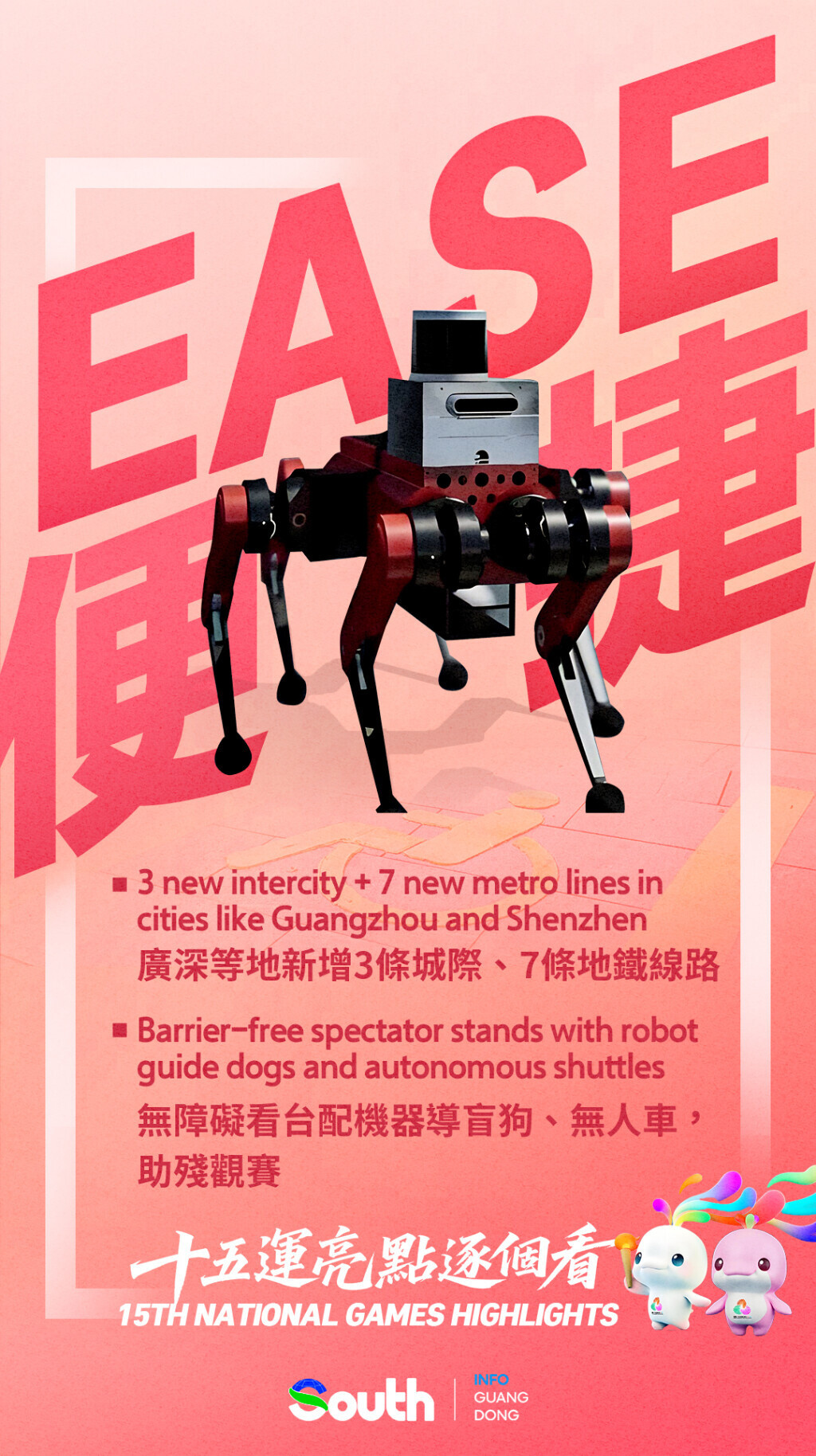 Transportation upgrades are another key focus. A total of 623 roads have been improved or expanded, and three new intercity rail lines and seven metro extensions in Guangzhou, Shenzhen,and other cities are set to open.For attendees with disabilities, the Games will provide smart barrier-free seating, autonomous shuttle buses, and robotic guide dogs.
