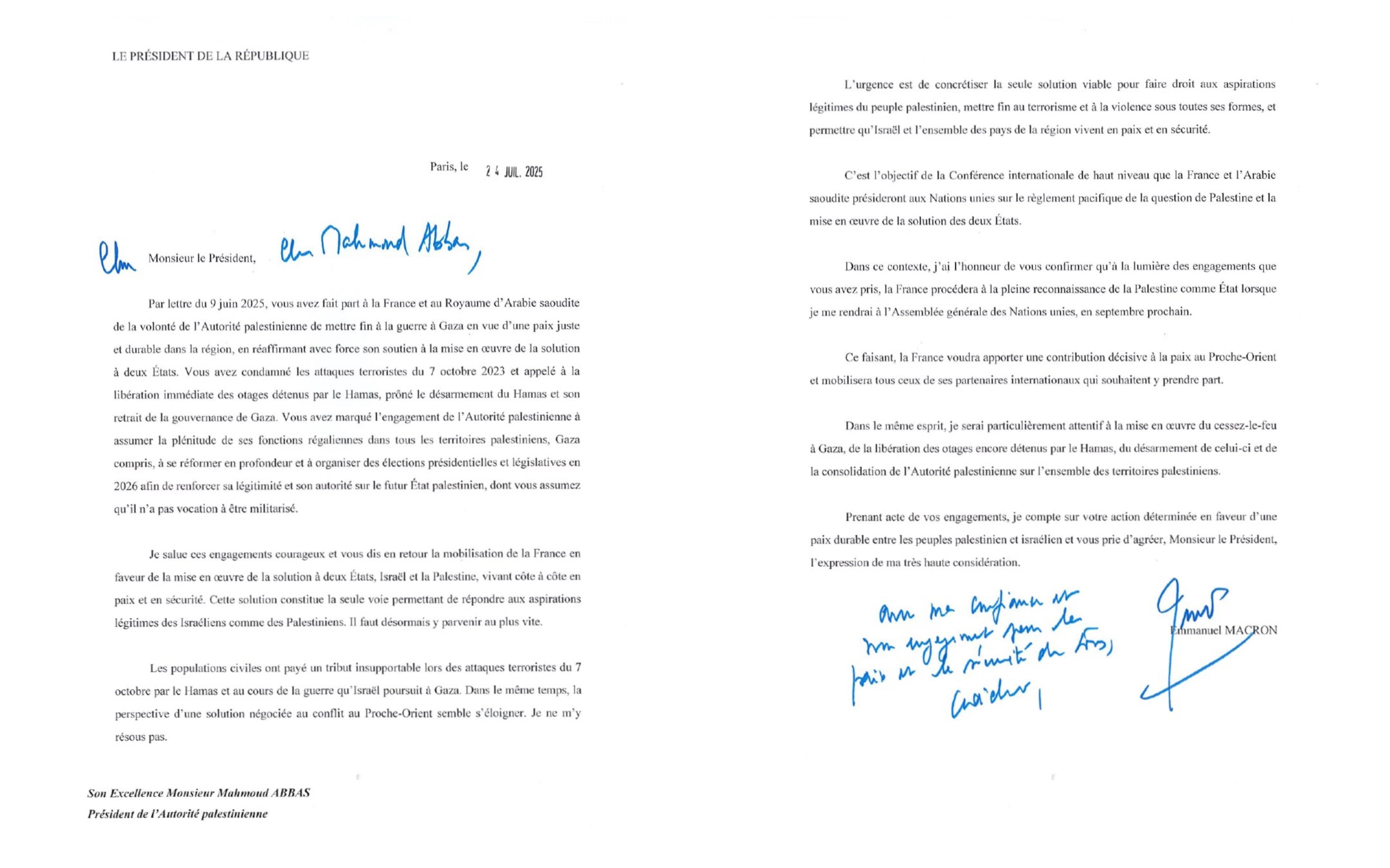 马克龙还同时公开了一封写给巴勒斯坦总统阿巴斯的正式信函,强调法国支持“两国方案”,并肯定阿巴斯在推动停火等方面作出的承诺。