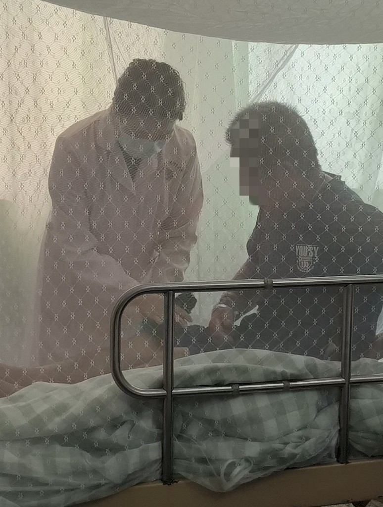 在治疗区内,记者看到,基孔肯雅热患者的病房均安装有纱门纱窗,各患者病床上均有蚊帐。