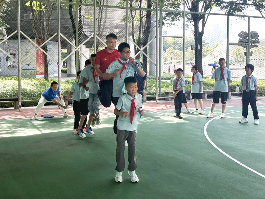 当天,跳水奥运冠军罗玉通和体操世界冠军陈一乐来到现场,一起为少先队员们送上祝福,为全运会打call。陈一乐鼓励两地少先队员们通过此次研学交到更多好朋友,用友谊与欢笑浇灌运动的种子。罗玉通则希望少先队员们能够通过此次研学感受全运氛围,体验广州风情,与研学营的小伙伴们一起找到自己喜爱的运动并坚持下去。“十五运会和残特奥会即将到来,相信来自全国各地的运动健儿们会为我们带来一场运动盛宴,让我们一起为他们加油。”他说。