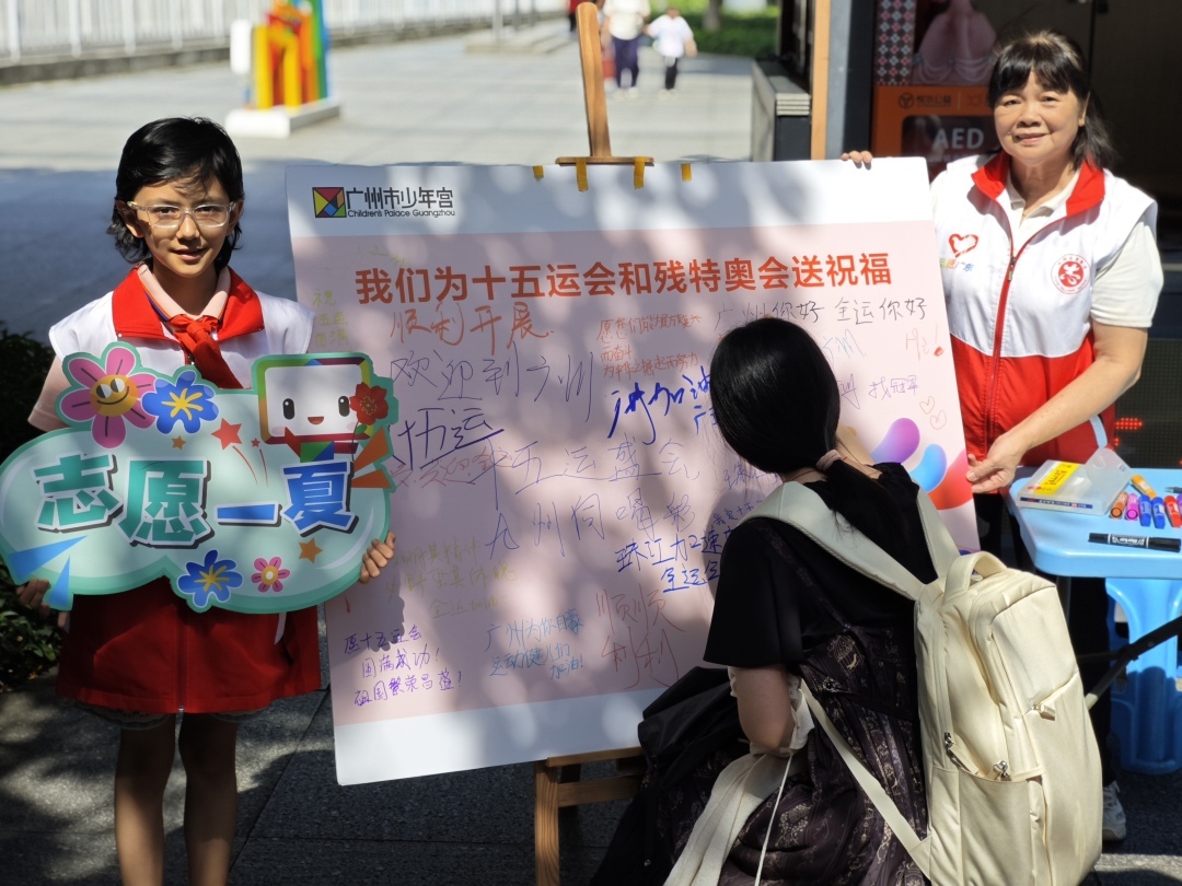 “您好,请问您可以和我们一起在宣传板上写下对十五运的祝福吗?”花城广场上,接受“志愿一夏”挑战的青少年们正在邀请往来市民为十五运会和残特奥会写下殷切期盼和真诚祝福。