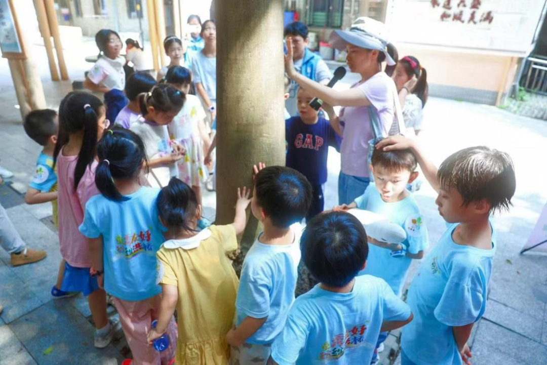 其中首场活动聚焦于社区丰富的植物资源。在社区活动中心,课程主讲老师风景园林设计高级工程师许哲瑶为孩子们揭开了植物分类学的初步面纱。从叶片形状、生长习性到植物的分类逻辑……这些看似抽象的概念,通过与社区内触手可及的“榕树家族”(高山榕、细叶榕、垂叶榕、黄葛树)以及开花乡土植物(大花紫薇、桂花、白兰、红花羊蹄甲)等具体物种相联系,在老师的引导下进行观察、触摸、闻香,一个个知识点变得鲜活易懂。