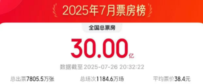 据网络平台数据,7月26日20时32分,2025年7月总票房破30亿。