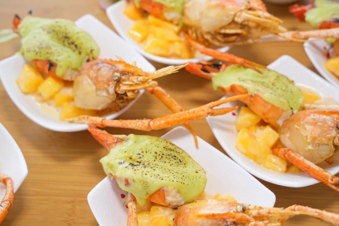 “我们这次带来的菜式是龙眼七彩捞青头鸭、牛油果焗东涌罗氏虾,两道菜都融入了东涌的当季食材,比如罗氏虾、龙眼等。其中,牛油果焗东涌罗氏虾以芒果铺底,表面再配上微微炙烤过的牛油果酱,口感清香又嫩滑,是一道非常适合夏天的菜式。”中大餐饮的主厨莫玉钊分享道。