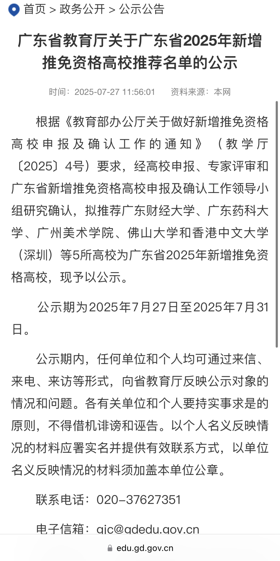 公示提到,根据《教育部办公厅关于做好新增推免资格高校申报及确认工作的通知》(教学厅〔2025〕4号)要求,经高校申报、专家评审和广东省新增推免资格高校申报及确认工作领导小组研究确认,拟推荐广东财经大学、广东药科大学、广州美术学院、佛山大学和香港中文大学(深圳)等5所高校为广东省2025年新增推免资格高校,现予以公示。公示期为2025年7月27日至2025年7月31日。