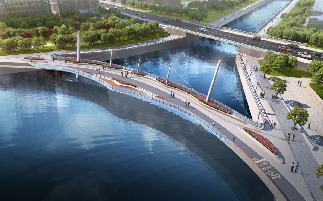 桥梁全长约96米,以“帆影流韵”为设计主题,将海上丝绸之路文化寓意和桥梁结构相融合,将帆船意象融入桥梁设计,塔柱与拉索形似帆船桅杆与缆绳,整体造型富有动感。桥面将设置3米宽步行道与2米宽跑步道,搭配休憩座椅、绿化花池等,满足不同群体需求,实现运动、通行与休闲功能的巧妙结合。同时,配备防滑铺装与护栏,保障老人、儿童出行安全。