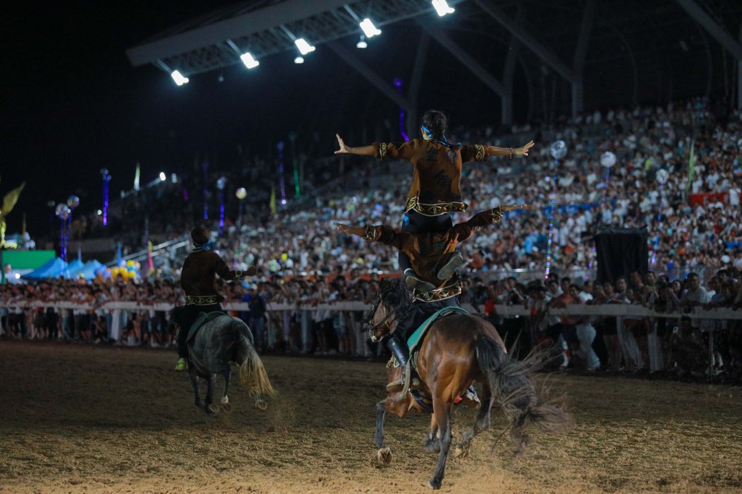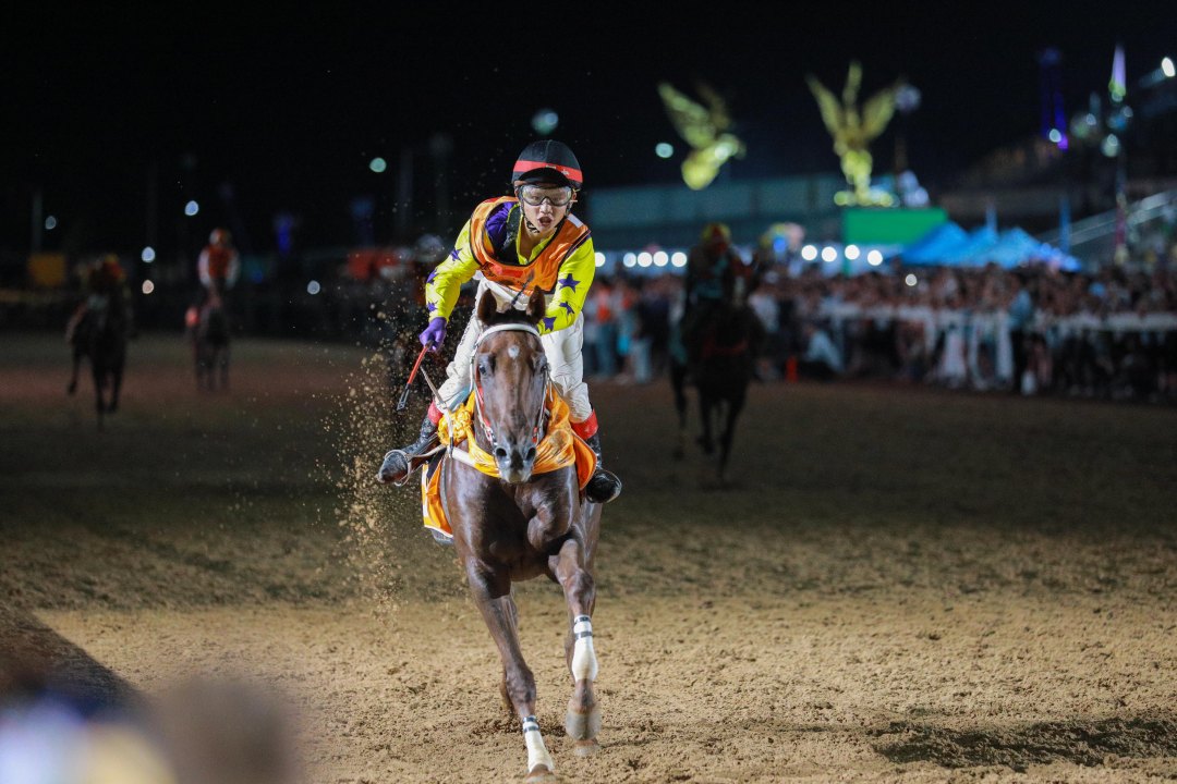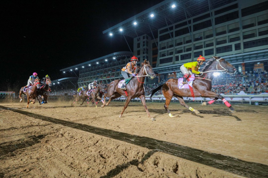 三都西部赛马城内,数万支荧光棒汇成星海,嘹亮的歌声直冲云霄。随着激昂的鼓点骤响,数十匹骏马抢闸而出,划破夜空,扬起的尘烟在灯光下幻化成流动的银河。四轮赛马紧张激烈,扣人心弦。骑手们俯身贴紧马背,与骏马融为一体,在赛道上疾驰,飞速掠过观众席,比赛中你追我赶,场面精彩,引人入胜,引得看台上爆发出震耳欲聋的欢呼声和掌声。