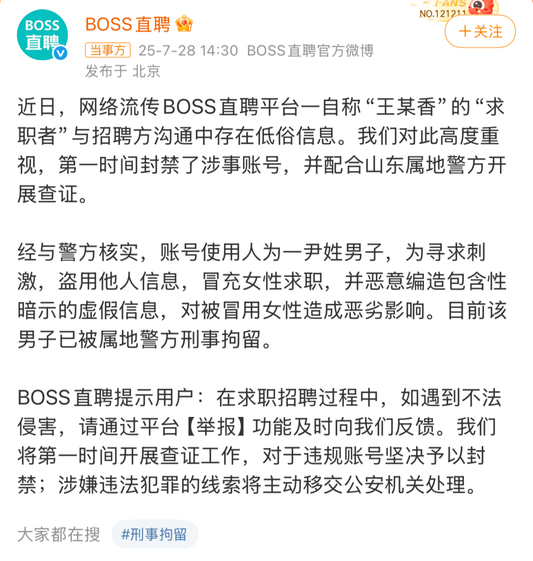 7月28日,BOSS直聘回应早前简历“风波”。BOSS直聘在其官方微博发声明称,近日,网络流传BOSS直聘平台一自称“王某香”的“求职者”与招聘方沟通中存在低俗信息,公司对此高度重视,第一时间封禁了涉事账号,并配合山东属地警方开展查证。