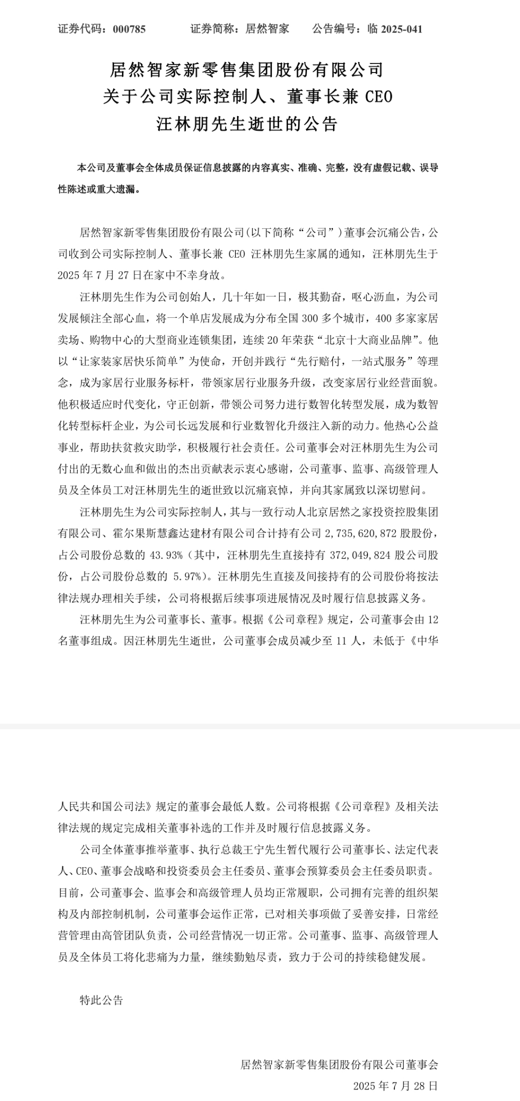 7月28日晚间,居然智家(000785.SZ)发布公告称,公司实际控制人、董事长兼CEO汪林朋于2025年7月27日在家中不幸身故。