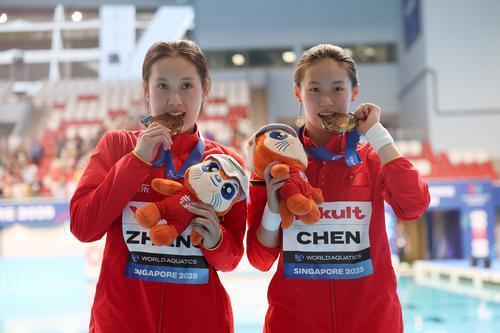 而“王者之师”中国跳水队今天继续“扫金”。掌敏洁/陈芋汐为中国队实现了女双10米台的世锦赛14连冠。掌敏洁说:“我俩的默契值奇奇怪怪的,时好时坏,但今天默契、配合都不错,可能决赛活动得比较开,然后比较兴奋。”陈芋汐则表示,尽管两人搭档时间不长,但能够有这样的成绩靠的“就是不断地磨合,不断地调整”。至此,陈芋汐也完成了女子双人10米台的世锦赛四连冠。她说:“只要我站在上面跳,我一定会百分百认真地去投入,拿出自己最好的状态去对待,尽自己的全力去跳好每一个动作。”