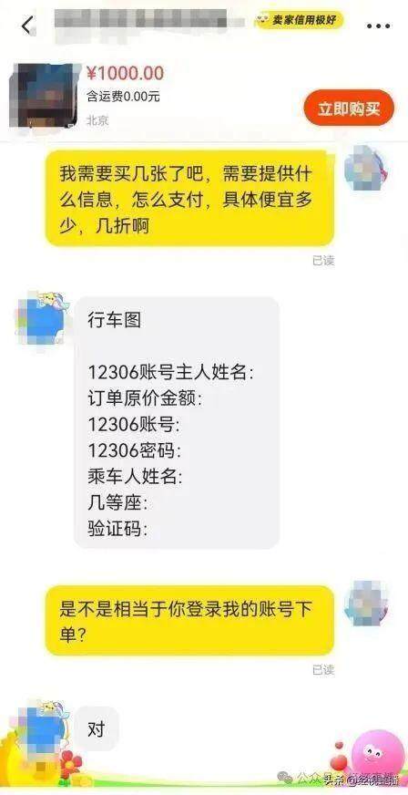 记者登录闲鱼APP看到,有多位卖家声称可提供商务座、一等座高铁动车票的65折至7折优惠券,根据卖家要求,买家需确定车次、时间、乘车人姓名,还要将行程信息截图发给卖家,至少支付1000元才能下单,还要向卖家提供12306账号主人的姓名、订单原价金额、12306账号、12306密码、座位等级以及验证码。卖家表示将使用优惠券代为购买车票。