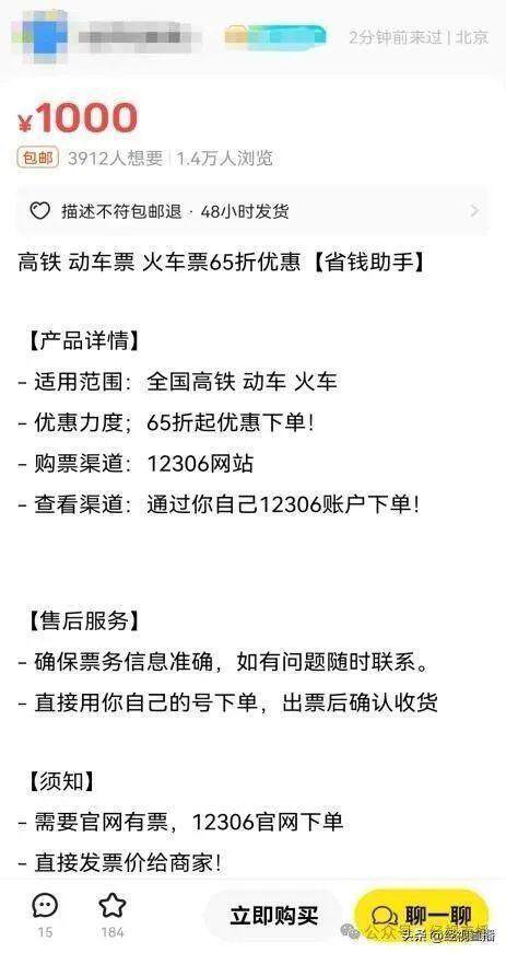 对于闲鱼上低价高铁票的问题,闲鱼客服回应称,闲鱼与铁路部门没有合作,平台上的低价高铁票,是卖家自己用了优惠券等方式买到后再打折卖出的。客服提醒,买这类票需要买家提供身份证等个人信息绑定车票,若出现问题需先行联系卖家协商售后。如果卖家拒绝退款,买家可以向平台投诉维权,平台核实后会直接退款给买家。客服还表示,平台无法提前核实卖家车票的真实性,购买这类票的风险需要买家自行承担。