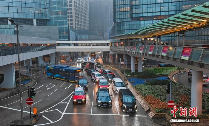 香港多条主要交通干线如干诺道西、德辅道西等,车辆通行基本顺畅,偶尔有公交车因路面积水减速,但未出现熄火或拥堵。
