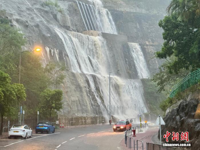 当日强降雨导致香港多个地区发生严重水浸。香港东区筲箕湾柏架山耀兴道附近曾在2023年“黑雨”期间发生严重山泥倾泻,当时有巨石滚落。记者现场观察,经修缮的山坡显得更稳固,雨水沿山体倾泻而下,形成“瀑布群”。“瀑布”水流沿耀兴道形成湍流,水深没过小腿,记者经过时一度踉跄,需紧握路边栏杆方可站稳。沿途经过的私家车和巴士纷纷打开车灯,降速行驶。不少的士停在路边,等待雨势缓和。