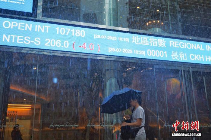 7月29日9时10分,香港天文台发布黑色暴雨警告信号,香港交易所根据2024年起实施的“恶劣天气交易安排”,香港的证券及衍生产品市场按照既定交易日历运作。图为香港中环交易广场的电子信息屏幕在黑色暴雨警告信号生效期间显示交易信息。 中新社记者 侯宇 摄