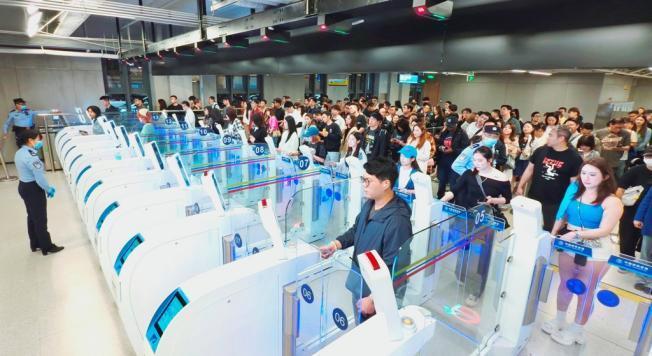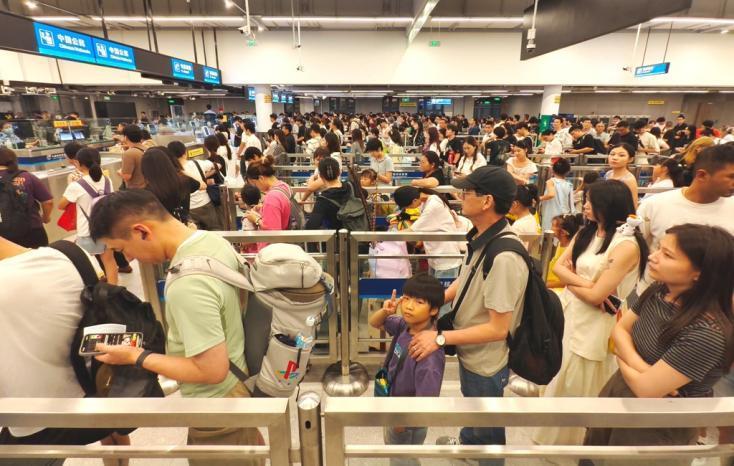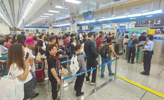 7月26日,多场演唱会和体育赛事在香港举办,在“周末+暑期”“汇演+赛事”相互叠加影响情况下,皇岗、福田口岸迎来出入境客流高峰。据深圳出入境边防检查总站统计,皇岗边检站执勤民警全天共查验出入境人员30.8万人次,创复关以来新高,其中入境旅客超过17万人次、出境旅客13.7万余人次。
