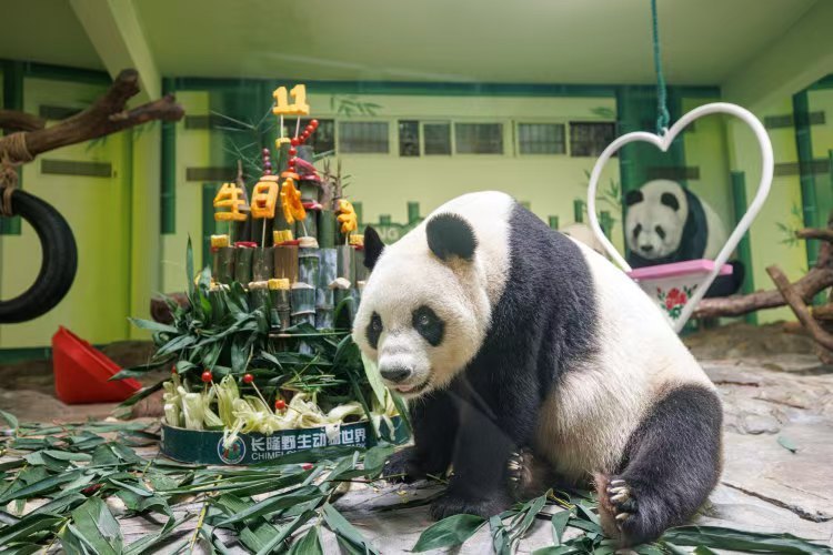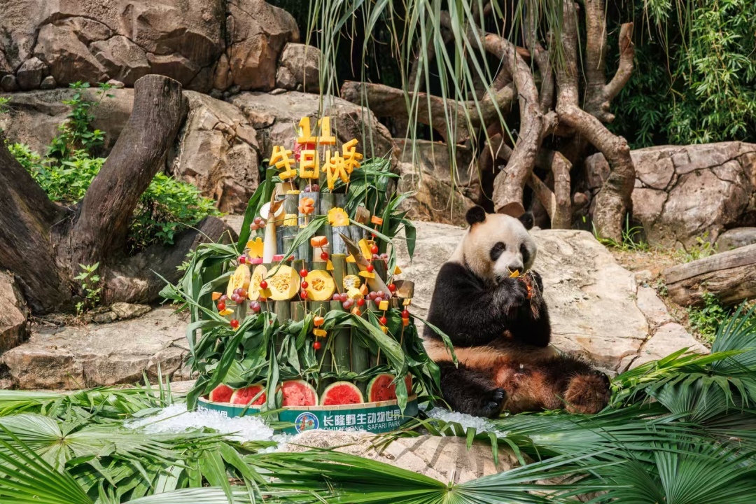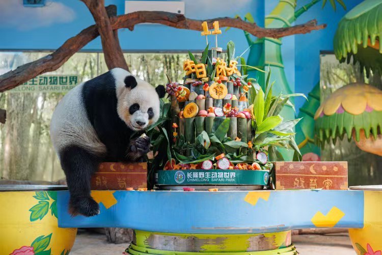 在温馨的生日歌声中,大熊猫“萌萌”“帅帅”“酷酷”闪亮登场。保育员陈淑青介绍,特制的生日蛋糕是由蜂蜜水、水果块、竹笋、胡萝卜和竹子等食材制作而成,兼顾健康和美味,深受“老广”大熊猫们的喜爱:“我们还研发了10余种大熊猫专用食谱,与中国竹子研究开发中心合作研发13种广东熊猫专用竹品种,为大熊猫提供适合华南生活的特色饮食,确保它们获得充足的营养。”今年全球唯一大熊猫三胞胎的生日可谓相当隆重,东非草原区矗立起一座近11米的巨型动物丰容蛋糕,成为抢眼的打卡点。