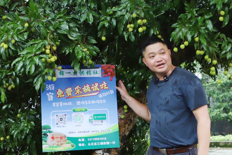 锦一村2025年迎来荔枝丰产,黄润财带领村民创新推出“免费采摘试吃”活动,紫田农业公园沿线300棵挂有供销社标识的荔枝树向游客敞开怀抱。这看似“舍”的举措,实为精准引流之“得”。尝鲜后的游客,纷纷通过村投公司便捷的线上线下渠道,将这份清甜带往远方。