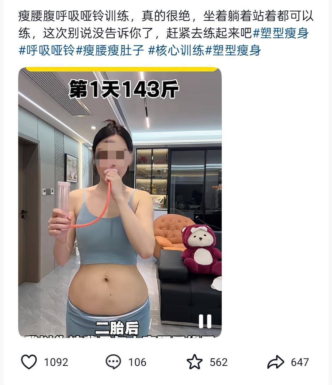 扬子晚报\/紫牛新闻记者在网上联系到一名购买“呼吸哑铃”的减肥者小金。今年22岁的她体重138斤,曾经有段时间她每天下班后都会平躺在瑜伽垫上,双手捧起一支呼吸哑铃,深吸一口气对着吹,呼吸哑铃内的砝码随之缓缓升起,腹部肌肉微微发酸。“坚持了有两周,肚子还没变化,呼吸确实更费力了,但最明显的感受其实是腮帮疼。”她苦笑道。这款“瘦腹神器”并不贵,只有不到50元,但感觉自己还是交了“智商税”。如今,“呼吸哑铃”早已在家中落了灰。