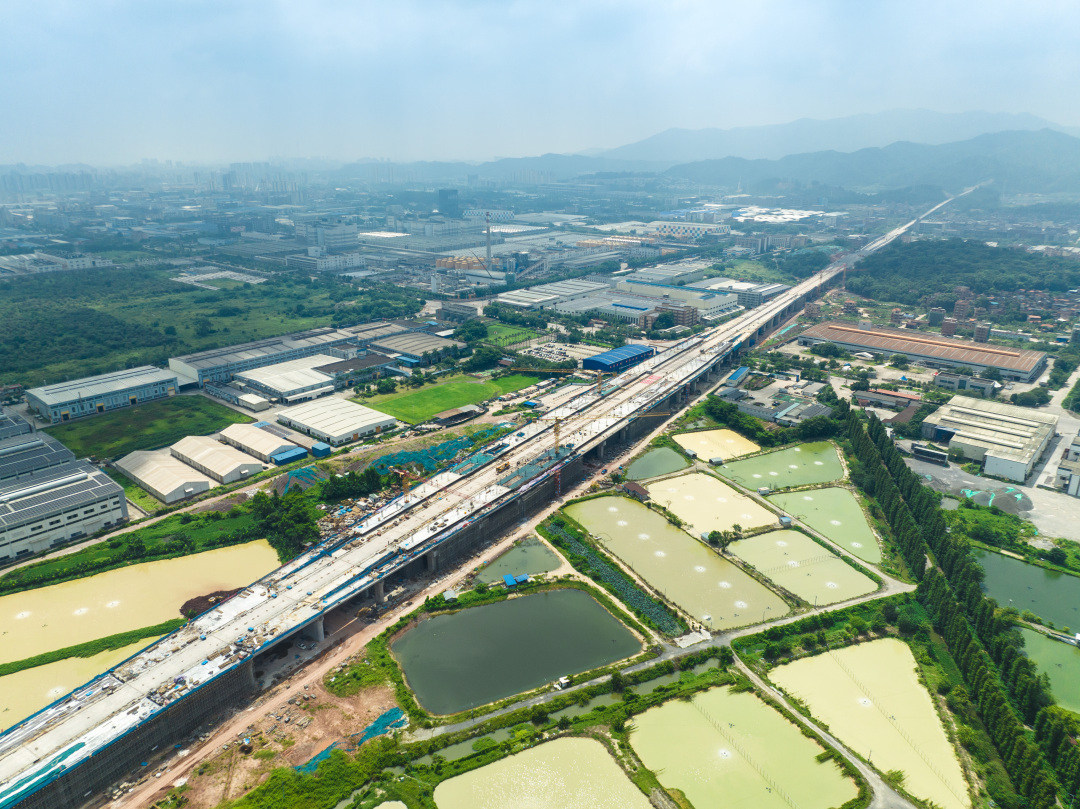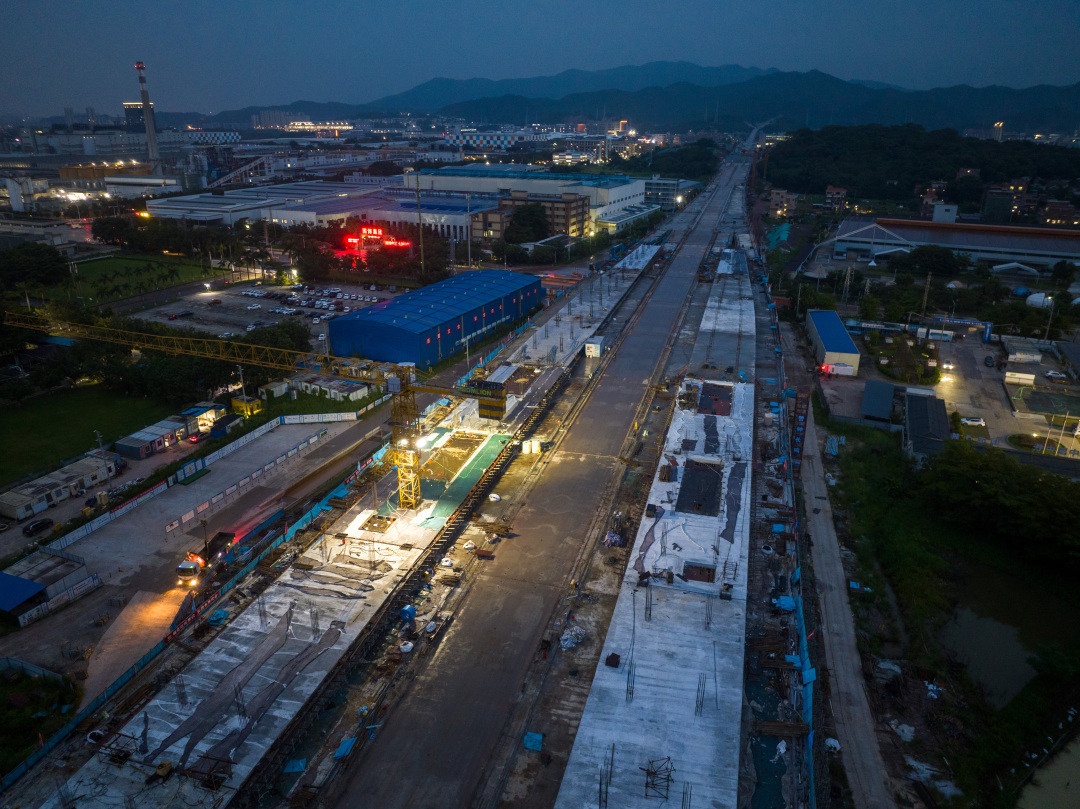 为确保现浇梁群施工任务顺利完成,项目团队提前制定专项施工方案,优化资源配置,周密部署,措施到位,责任到人。施工过程中,配备专职安全员,全程负责施工现场的安全管理与隐患排查,确保施工过程零安全事故;采用智能张拉、压浆设备、现浇梁预应力体系三向定位装置、三墙钢筋定位卡具等新工艺,有效提升了整体施工质量效率,确保安全、质量与进度的有机统一。全体干部员工克服高温酷暑、暴雨台风、交叉作业等诸多挑战,优质高效完成了混凝土浇筑施工任务,为后续桥面附属及高明站内站后各专业进场提供了有利条件。
