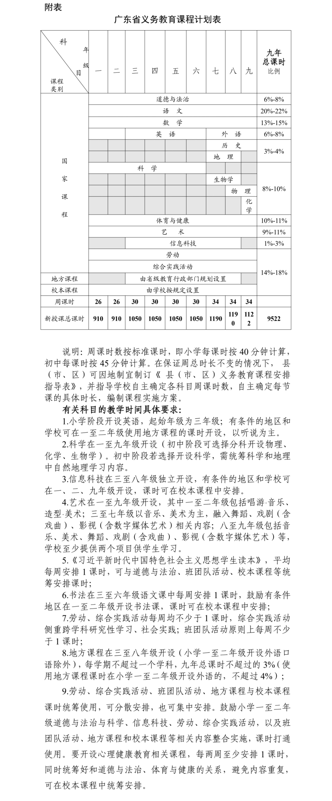 记者查阅广东省教育厅于2024年9月印发的《广东省义务教育阶段课程实施办法(2024年版)》(以下简称《实施办法》)获悉,在教学安排方面,该《实施办法》明确了一至二年级每周26课时,三至六年级每周30课时,七至九年级每周34课时,九年新授课总课时数为9522。小学每课时按40分钟计算,初中每课时按45分钟计算。学校在保证周总时长不变的情况下,自主确定各科目周课时数,自主确定每节课的具体时长,或根据学科特点、课程实施需要开展长短课、大小课。