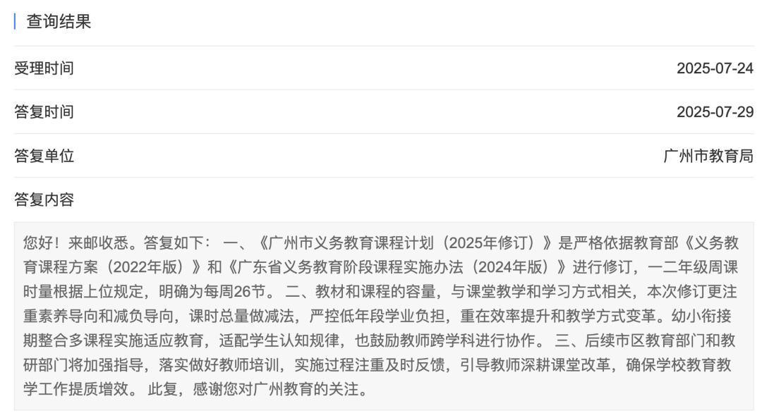 针对市民提出的建议,7月29日,广州市教育局在官网发布回复称,《广州市义务教育课程计划(2025年修订)》是严格依据教育部《义务教育课程方案(2022年版)》和《广东省义务教育阶段课程实施办法(2024年版)》进行修订的,一二年级周课时量根据相关规定,明确为每周26节。