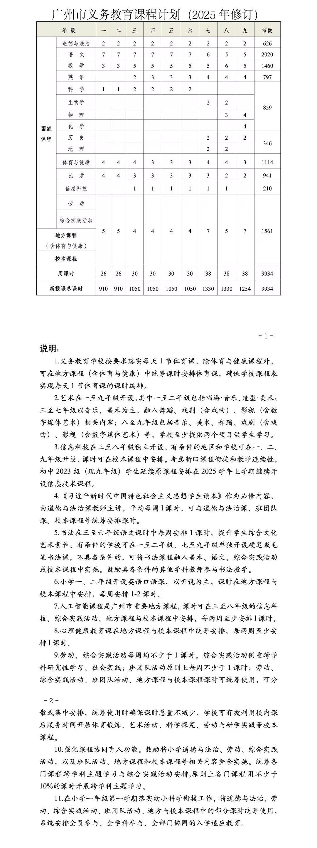 相较2023年7月印发的《广州市义务教育课程计划(试行)(2023年修订)》,本次《广州市义务教育课程计划(2025年修订)》的主要变化包括: