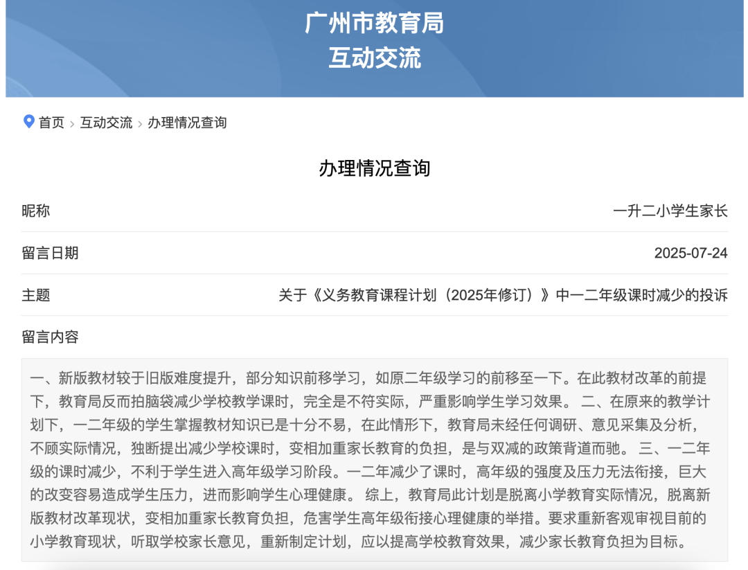 对此,近日有市民在广州市教育局官网留言认为,一二年级课时减少脱离小学教育实际情况,应听取学校家长意见,重新制订计划。市民在留言中表示,“新版教材较旧版难度提升,部分知识前移学习”,“在原来的教学计划下,一二年级的学生掌握教材知识已十分不易”,在此情况下,减少课时不符实际,会影响学生学习效果,不利于学生过渡衔接进入高年级的学习阶段,加重学生学习压力,也可能变相加重家长的教育负担。