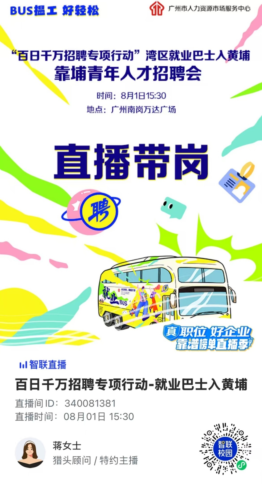 广州市人力资源市场服务中心倾力打造的“湾区就业巴士”即将抵达黄埔!8月1日(星期五)15:30—18:30,“百日千万招聘专项行动”湾区就业巴士入黄埔—靠埔青年人才招聘会活动将在广州南岗万达广场1号门举办,欢迎广大群众热情参与。