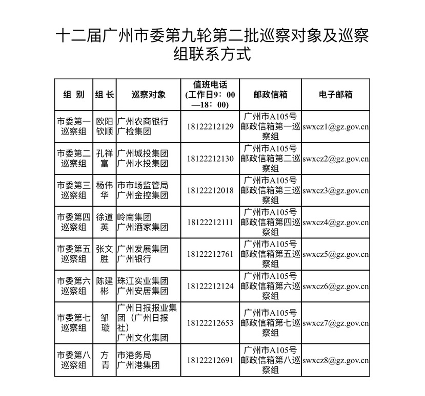 根据安排,对第二批单位的巡察从7月下旬开始至9月底结束。巡察期间,市委各巡察组分别设置专门值班电话、邮政信箱、电子邮箱和“广州码上巡”微信二维码,主要受理反映被巡察党组织领导班子及其成员、下一级党组织主要负责人和重点岗位领导干部(含已退休、已调离)问题的来信来电来访,重点是违反政治纪律、组织纪律、廉洁纪律、群众纪律、工作纪律和生活纪律等方面的举报和反映。巡察组受理信访时间截止到2025年9月26日。同时,设立对巡察组的监督电话12388,欢迎广大干部群众对巡察组进行监督。
