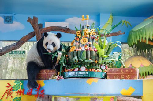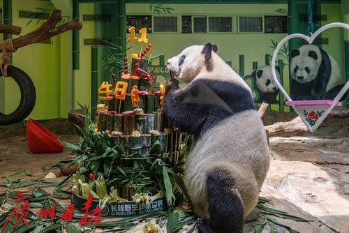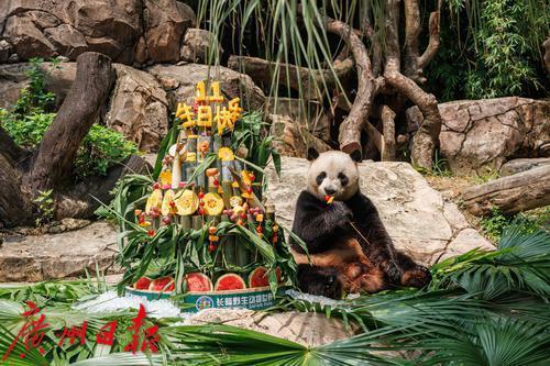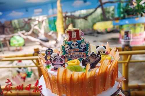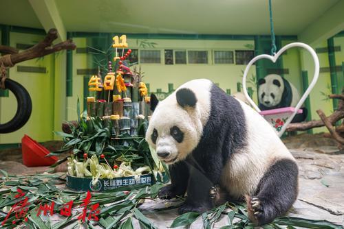 保育员陈淑青介绍,特制的生日蛋糕是由蜂蜜水、水果块、竹笋、胡萝卜和竹子等食材制作而成,兼顾健康和美味,深受“老广”大熊猫们的喜爱。