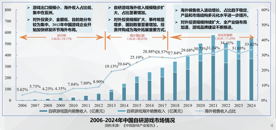 2018年至今的优化发展期,中国自研游戏海外销售收入规模波动增长、占比趋于稳定。从2018年到2024年,中国自研游戏海外收入由95.9亿美元上升至185.6亿美元,海外收入占比从27.8%增长至33.6%。