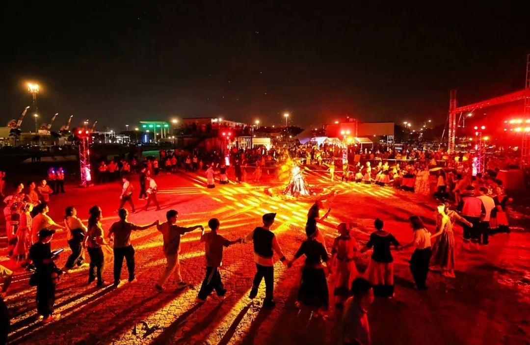 当金色篝火如绸缎般舞动夜空,活动迎来最激动人心的时刻!各族同胞手牵手、心连心,环绕跃动的光与热,踏着同一节拍纵情共舞。跳跃火光映照着一张张喜悦笑脸。这一刻,音乐与火焰熔铸成民族团结最炽热、最鲜活的图腾。