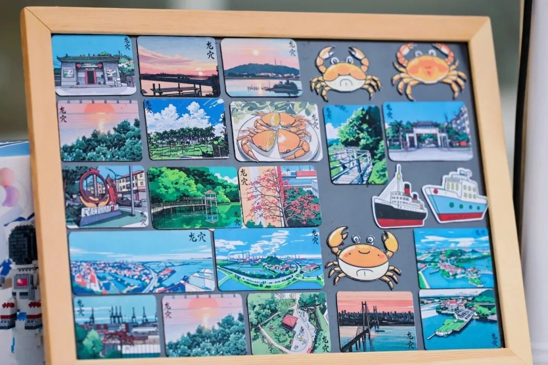 其中,以“梦想”号、“黄油蟹”“龙宫仙山”“白鹭湿地”“龙宫阁”“张保仔洞”等龙穴特色文旅IP为主题的冰箱贴、胸针等文创产品广受欢迎。