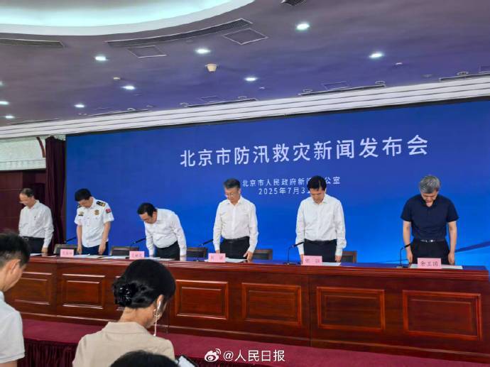 31日,北京市人民政府新闻办公室举行北京市防汛救灾新闻发布会。会场向遇难者默哀。