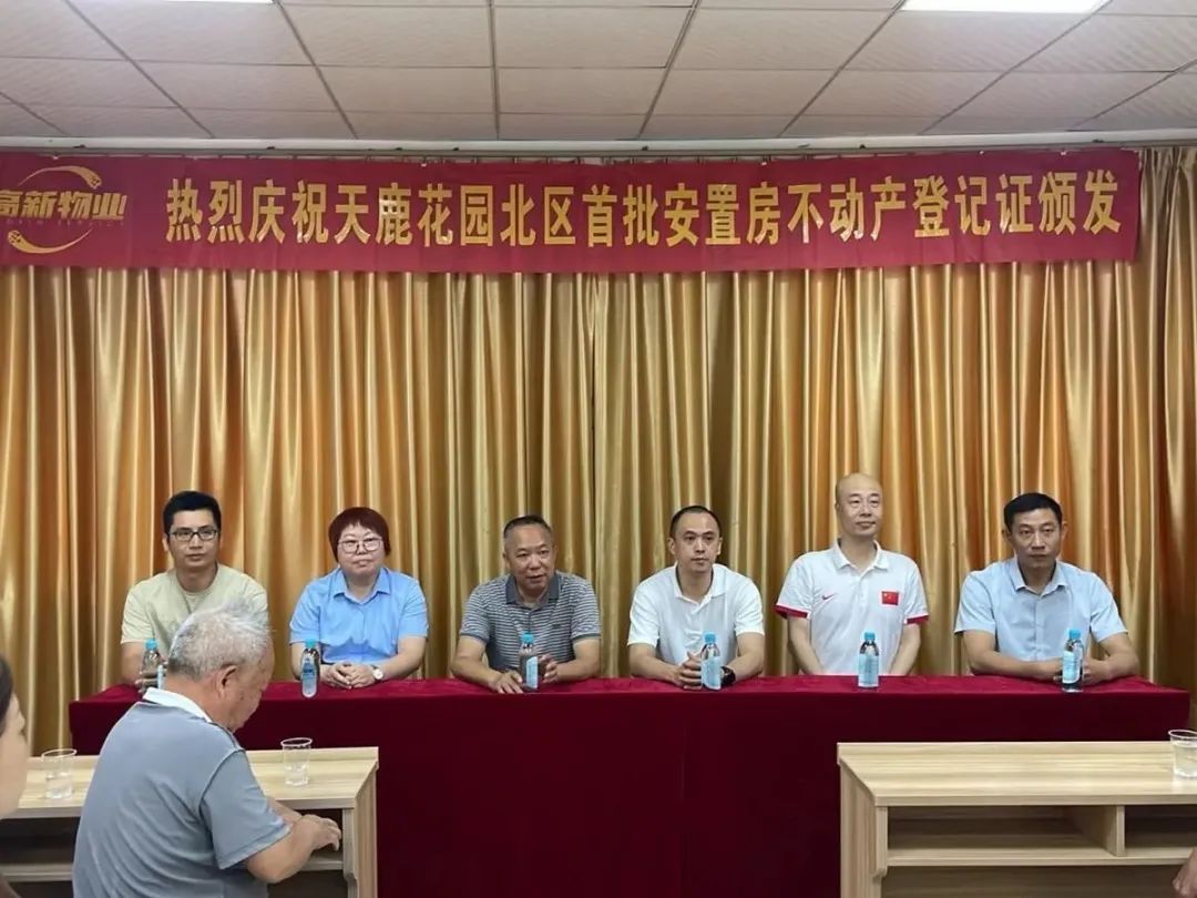 2025年5月16日,天鹿花园北区首批安置房不动产登记颁发现场,联和社区居委会、广州黄陂投资有限公司、广州高新发展有限公司等为现场的居民颁发房产证。