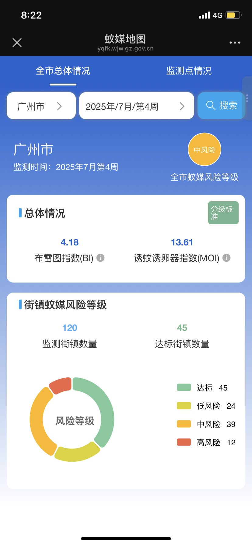 记者从广州市疾病预防控制中心发布的蚊媒监测地图了解到,7月第4周,广州全市蚊媒风险等级处于中风险。7月第4周覆盖全市120个街镇的监测中,北京街道、景泰街道、光塔街道、登峰街道、大石街道、桥南街道、南岗街道、石楼镇等12个街镇被评定为高风险区域。