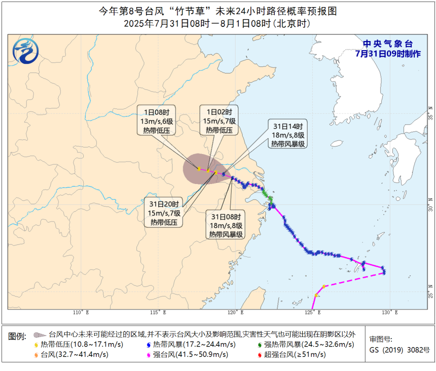 据气象部门监测,7月31日10时,"竹节草"中心位于江苏省金坛境内,目前仍维持热带风暴级强度,正缓慢向西偏北方向移动。预计今夜至次日早晨,台风将移入安徽境内,并减弱为热带低压。