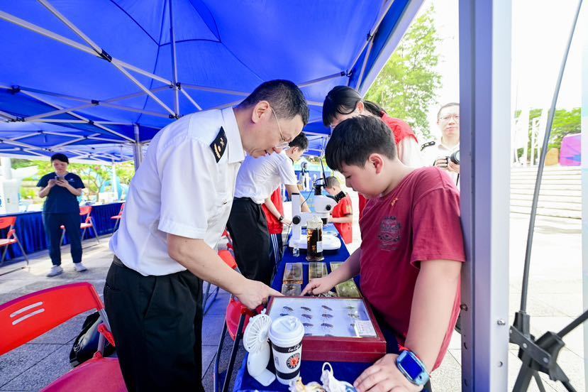 “叔叔,这是什么虫?”“小朋友,这是全世界上最大的甲虫——战神大兜虫,大家可要注意不能私下交易这种虫。”在主舞台一侧,结合文明实践、十五运赛事项目、非遗等,设置了文明实践种志计划项目展示区、全运会主题互动区、文明迎全运游戏区、非遗体验(展示)区,吸引众多市民驻足参与。其中,“携手‘关’筑国门生物安全”摊位吸引多位市民朋友围观,大家纷纷走上前询问展台前摆放的各类动植物标本,一旁还摆设有显微镜提供市民观察红火蚁的标本。