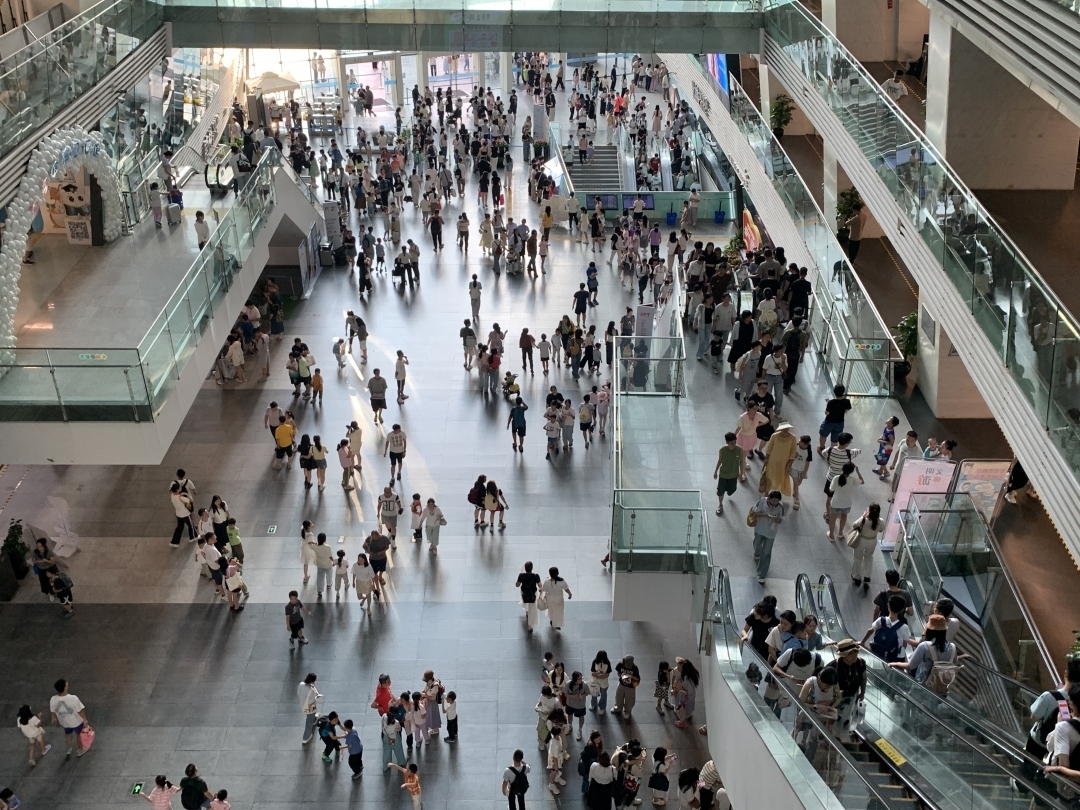记者走访看到,由于正值暑假,馆内人流量增长明显,特别是不少家长带着小孩前来图书馆,馆内的喧闹声随处可见。在一楼,有小朋友互相追逐打闹,有家长高声呼喊和惊叫,有成年人高声谈话嬉笑,有接打电话声、有推动行李或者货物的噪声……各种噪声交织。