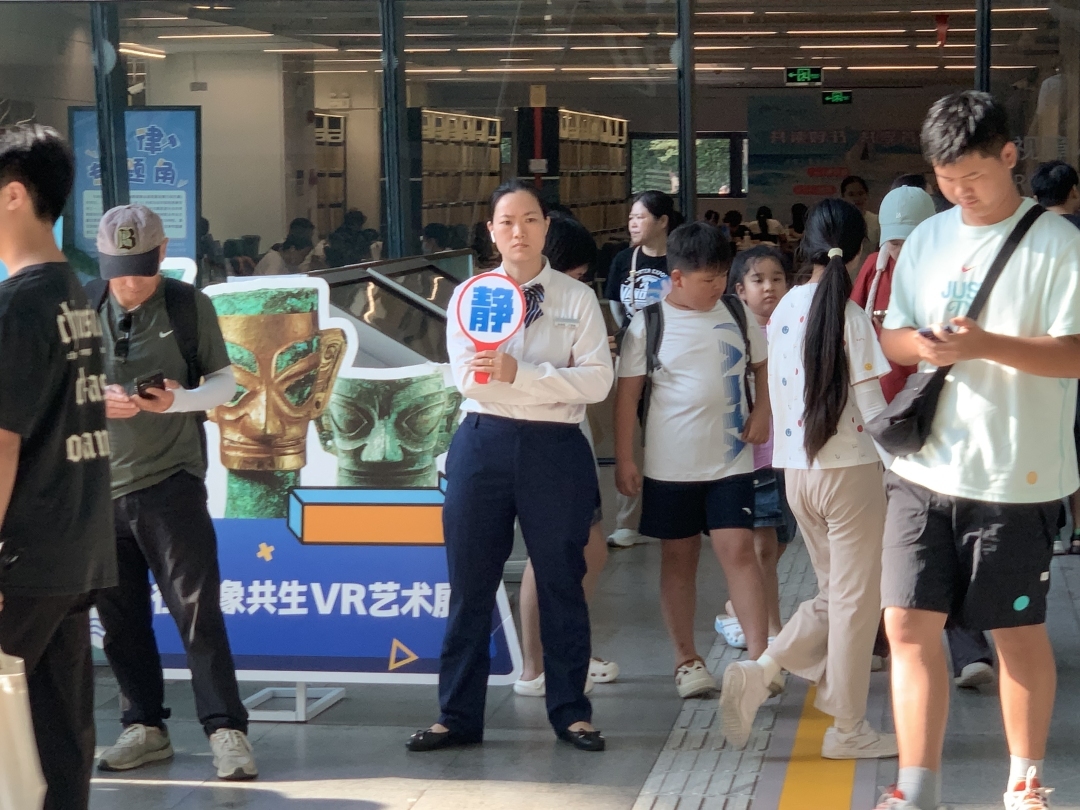 尽管馆内有工作人员拿着“安静”提示牌巡回提醒馆内人员要安静,不要发出喧闹和噪声,但收效甚微,许多人都熟视无睹。