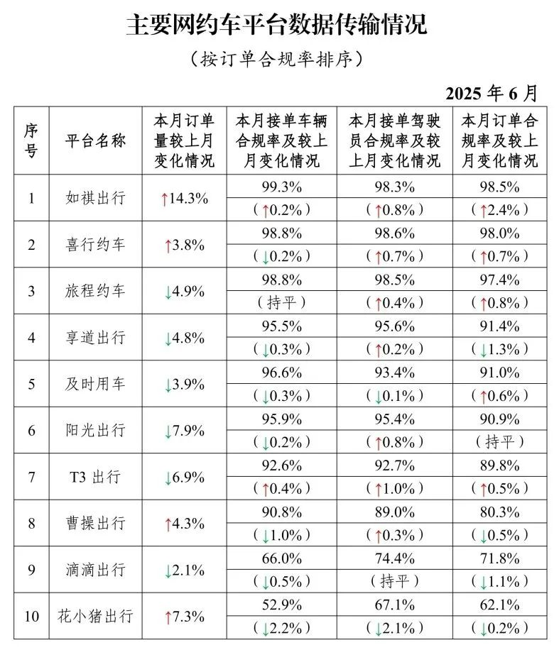 7月31日,交通运输部发布网约车监管信息交互系统统计数据显示,在6月订单量前10名的平台中,按订单合规率(指驾驶员和车辆均获得许可的订单量占比)从高到低的分别是如祺出行、喜行约车、旅程约车、享道出行、及时用车、阳光出行、T3出行、曹操出行、滴滴出行、花小猪出行。