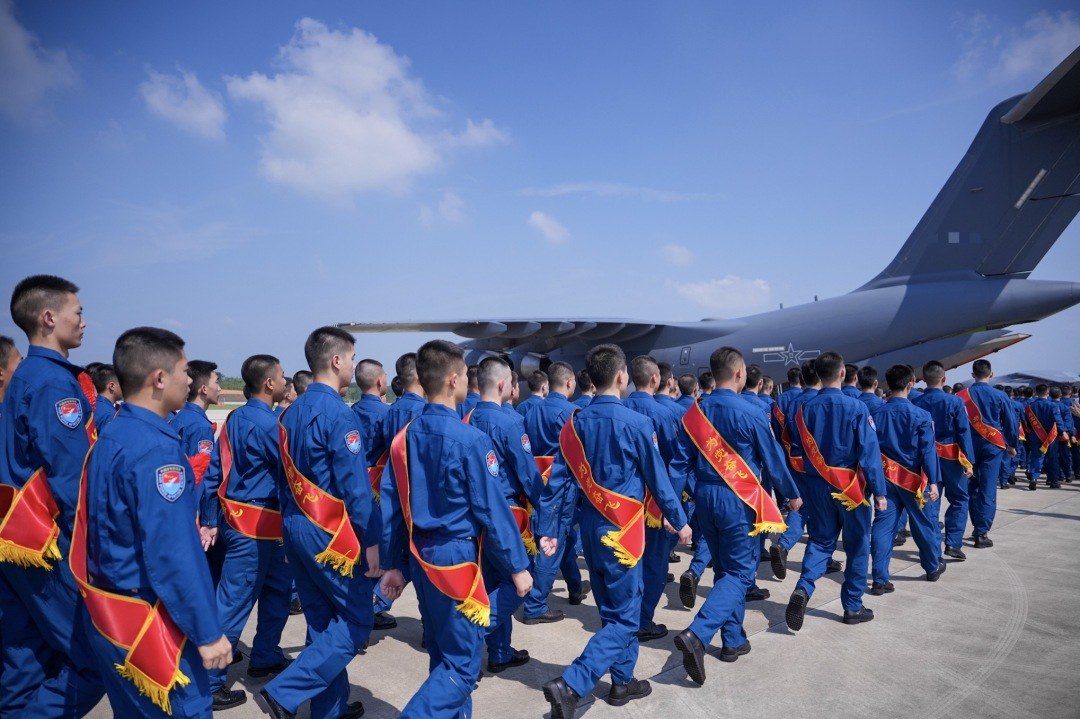 仪式现场,飞行员代表与新学员齐聚一堂,分享成长经历。起飞后,运-20机长代表机组发出寄语,勉励新学员奋楫扬帆、逐梦而行,以青年之姿担时代重任,怀赤诚之心守万家灯火,用青春脚步踏响强军征程。